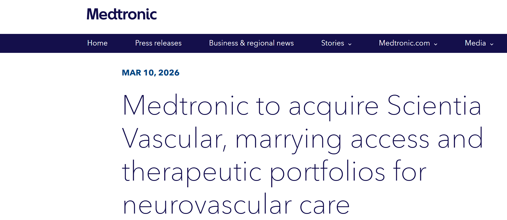 神经血管赛道再迎重磅并购!2026年3月10日,全球医疗器械巨头美敦力(Medtronic)正式宣布,将以5.5亿美元收购美国神经血管器械公司Scientia Vascular,同时附带潜在里程碑付款条款,交易预计于2027财年上半年(约2026年底至2027年初)完成交割。