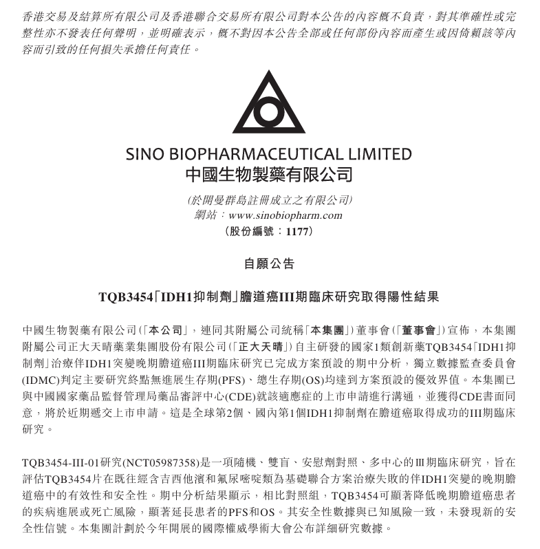 3月12日,中国生物制药发布一则关键性公告,其附属公司正大天晴药业集团自主研发的国家1类创新药TQB3454,在治疗伴IDH1突变的晚期胆道癌的关键III期临床研究中取得重大成功。