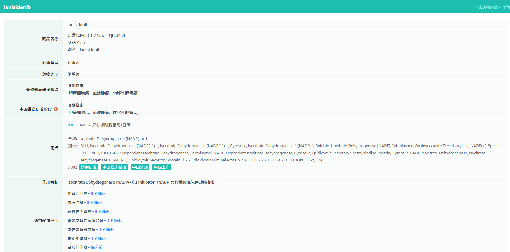 据摩熵医药数据库显示,TQB3454-III-01研究(ClinicalTrials.gov登记号:NCT05987358)旨在评估TQB3454在既往经含吉西他滨和氟尿嘧啶类为基础联合方案治疗失败的、伴IDH1突变的晚期胆道癌患者中的疗效与安全性。