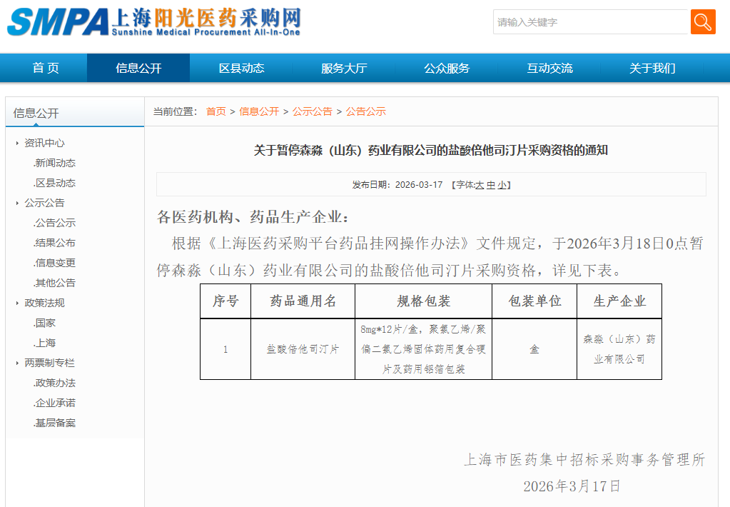 2026年3月17日,上海阳光医药采购网挂出一则通知,根据上海市医药集中招标采购事务管理所发布的《关于暂停森淼(山东)药业有限公司的盐酸倍他司汀片采购资格的通知》,依据《上海医药采购平台药品挂网操作办法》文件规定,自2026年3月18日0时起,暂停采购该公司生产的盐酸倍他司汀片。