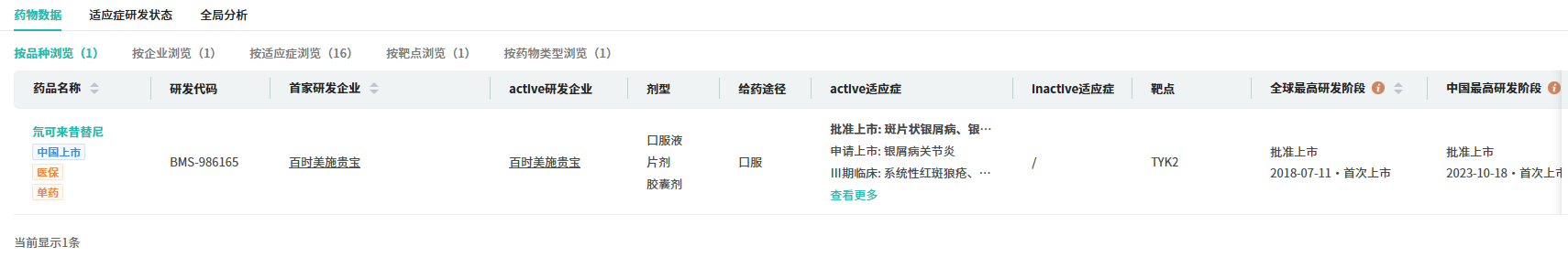 摩熵医药数据库显示,目前全球仅有百时美施贵宝氘可来昔替尼一款TYK2抑制剂获批上市,其适应症已覆盖斑块状银屑病、脓疱性银屑病、红皮病型银屑病及银屑病关节炎。2025年,该药全球销售额达2.91亿美元,同比增长18.29%,显示出该靶点的治疗潜力与市场前景。