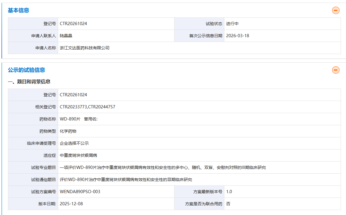 3月18日,中国药物临床试验登记与信息公示平台最新信息显示,浙江文达医药已正式登记启动WD-890片治疗中重度斑块状银屑病的III期临床研究。摩熵医药数据显示,此前已有4款国产TYK2抑制剂进入III期临床,WD-890片成为第5款迈入关键III期阶段的国产TYK2抑制剂,标志着该靶点在国内的研发竞争进入新的关键阶段。