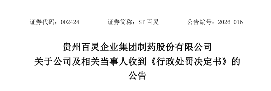 3月27日,贵州百灵发布多则公告,公司及相关当事人分别收到贵州证监局下发的《行政处罚决定书》。贵州百灵因年报虚假记录被合计处罚2490万,同时董事长被10年禁业。