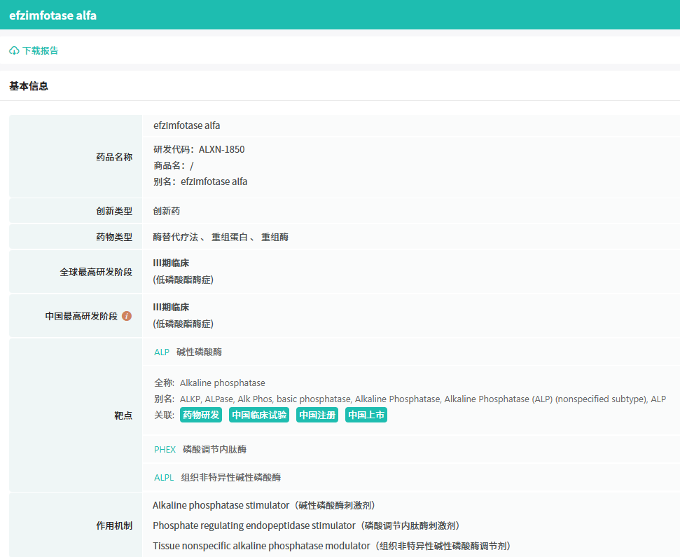Efzimfotase alfa正是针对这一痛点设计的“下一代”酶替代疗法(ERT)。其独特的工程化改造使得药物能够通过每两周一次的皮下注射维持疗效,且注射体积显著小于Strensiq。这种给药方案的优化,有望极大地提升患者的依从性与生活质量,重塑HPP的长期管理模式。