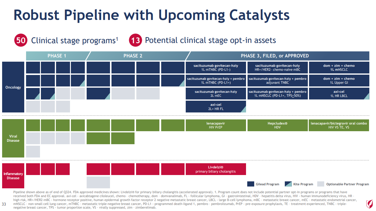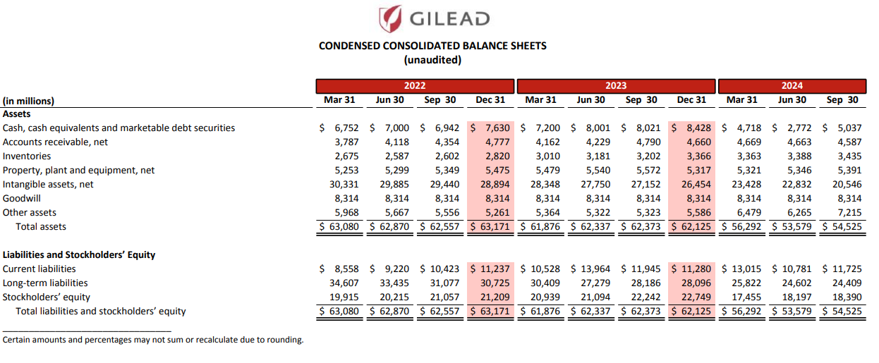 截至2024年9月30日,吉利德公司的现金、现金等价物和有价债务证券为50.37亿美元,而截至2023年12月31日为84亿美元。减少的主要原因是以39亿美元收购了 CymaBay Therapeutics公司。