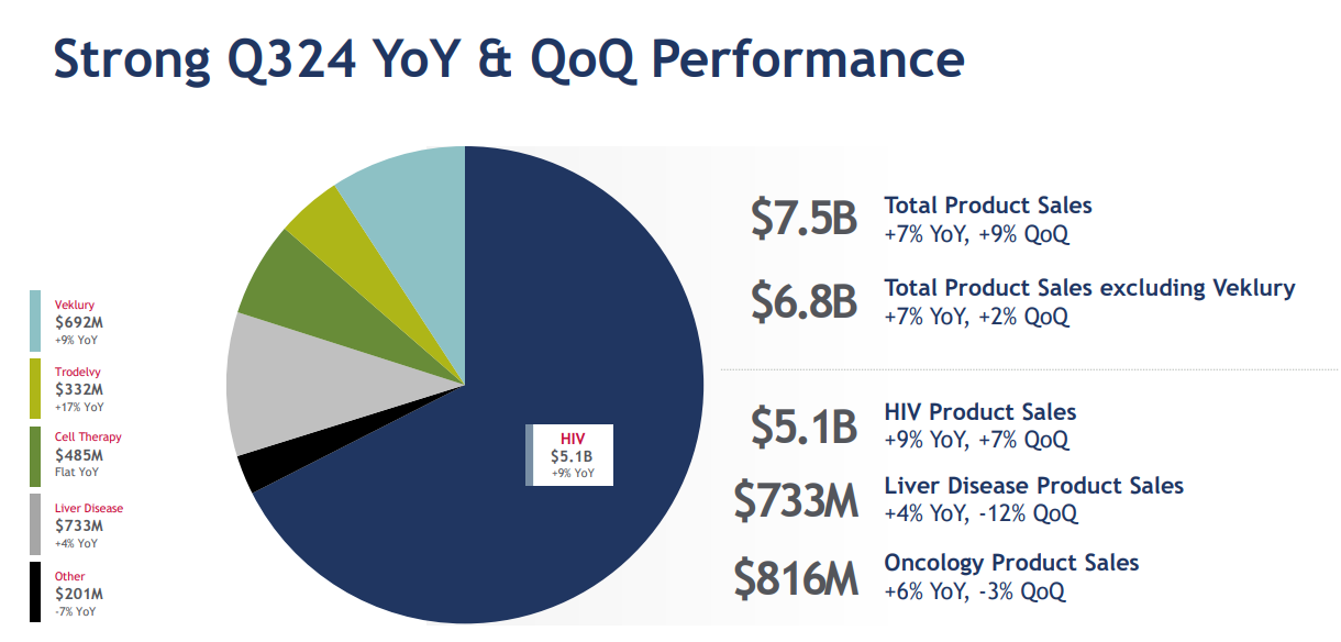 近日,吉利德发布了2024年第三季度业绩:2024年前三季度总营收211.85亿美元,同比增长6%;2024 Q3总营收75.45亿美元,与去年同期相比增长5%,这主要是由于HIV药物(51亿美元,+9%)、Veklury(6.92亿美元,+9%)、肿瘤(8.16亿美元,+6%)和肝病药物(7.33亿美元,+4%)的销售额增长。研发投入13.95亿美元,同比下降4%。