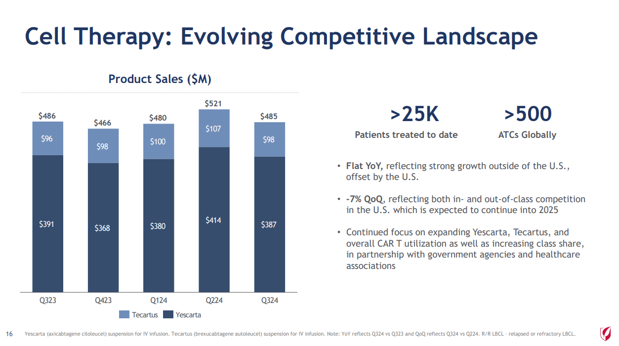 细胞疗法方面,两款CAR-T产品Yescarta®和Tecartus®2024年前三个季度总销售额为14.86亿美元(约107亿元),同比增长6%;2024 Q3销售额共计4.85亿美元(约34.82亿元),与2023年同期持平。