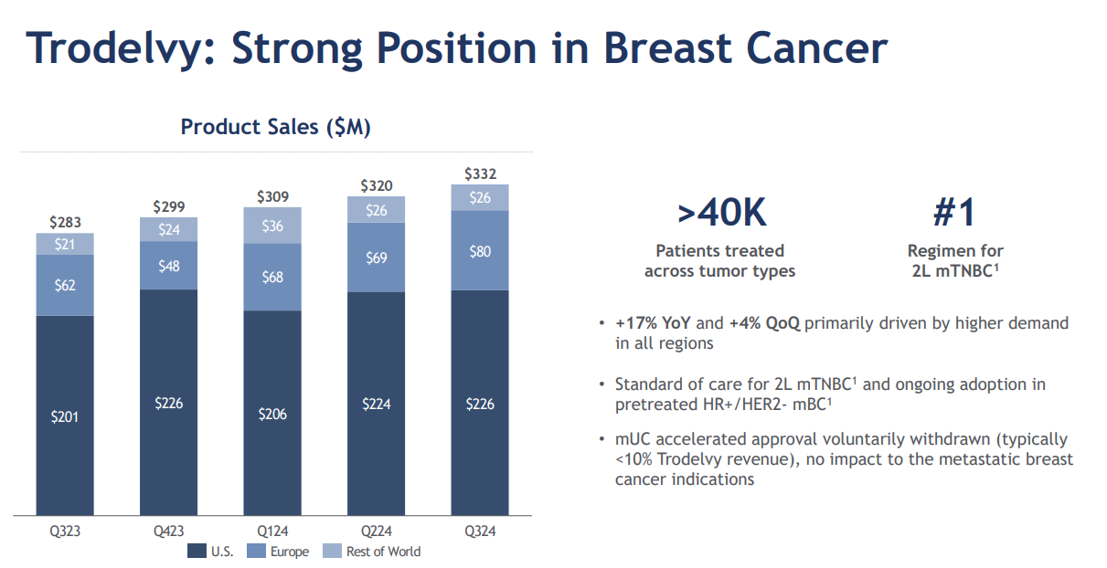 Trodelvy是全球首个TROP-2 ADC药物,是吉利德在2020年收购Immunomedics时的璀璨明珠,收购价高达210亿美元。2023年该产品销售额达到10.65亿美元,首次跻身重磅炸弹行列。2024 Q3销售额为3.32亿美元,同比增长17%,环比增长4%,销售逐渐放缓,加上试验暴雷不断,想回本是任重道远。