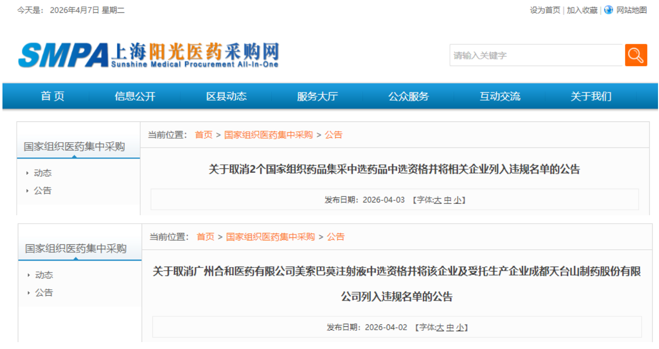 4月3日,上海阳光采购网发布公告,因未按协议满足供应,北京阜康仁的盐酸多巴胺注射液和Hetero Labs的达格列净片被取消中选资格。并将两家企业被列入“违规名单”,暂停参与国家集采申报资格长达四年,直至2030年4月2日。
