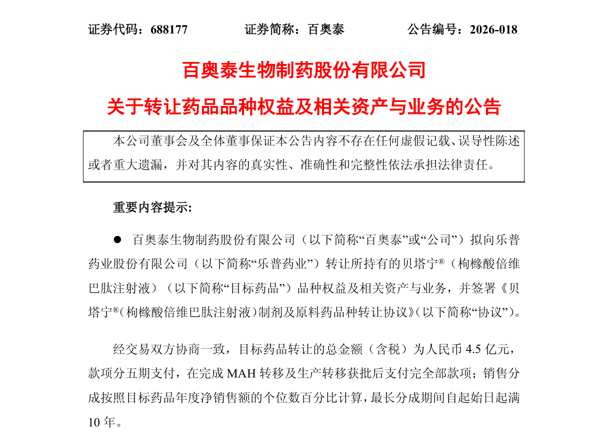 4月14日,百奥泰生物发布公告,拟将旗下核心品种——贝塔宁®(枸橼酸倍维巴肽注射液)的全部权益及相关资产与业务,正式转让给乐普药业。双方已签署《贝塔宁®(枸橼酸倍维巴肽注射液)制剂及原料药品种转让协议》。