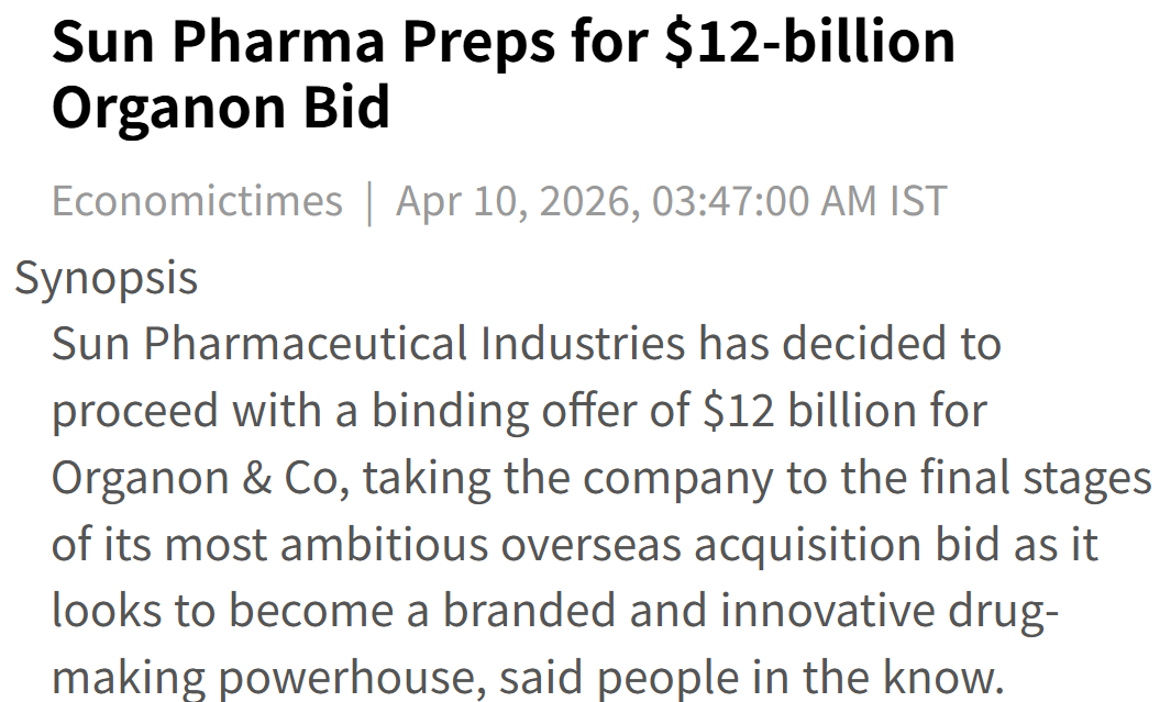 [3] https://www.icicidirect.com/research/equity/trending-news/sun-pharma-nears-12b-acquisition-of-organon-marking-largest-indian-overseas-pharma-deal
