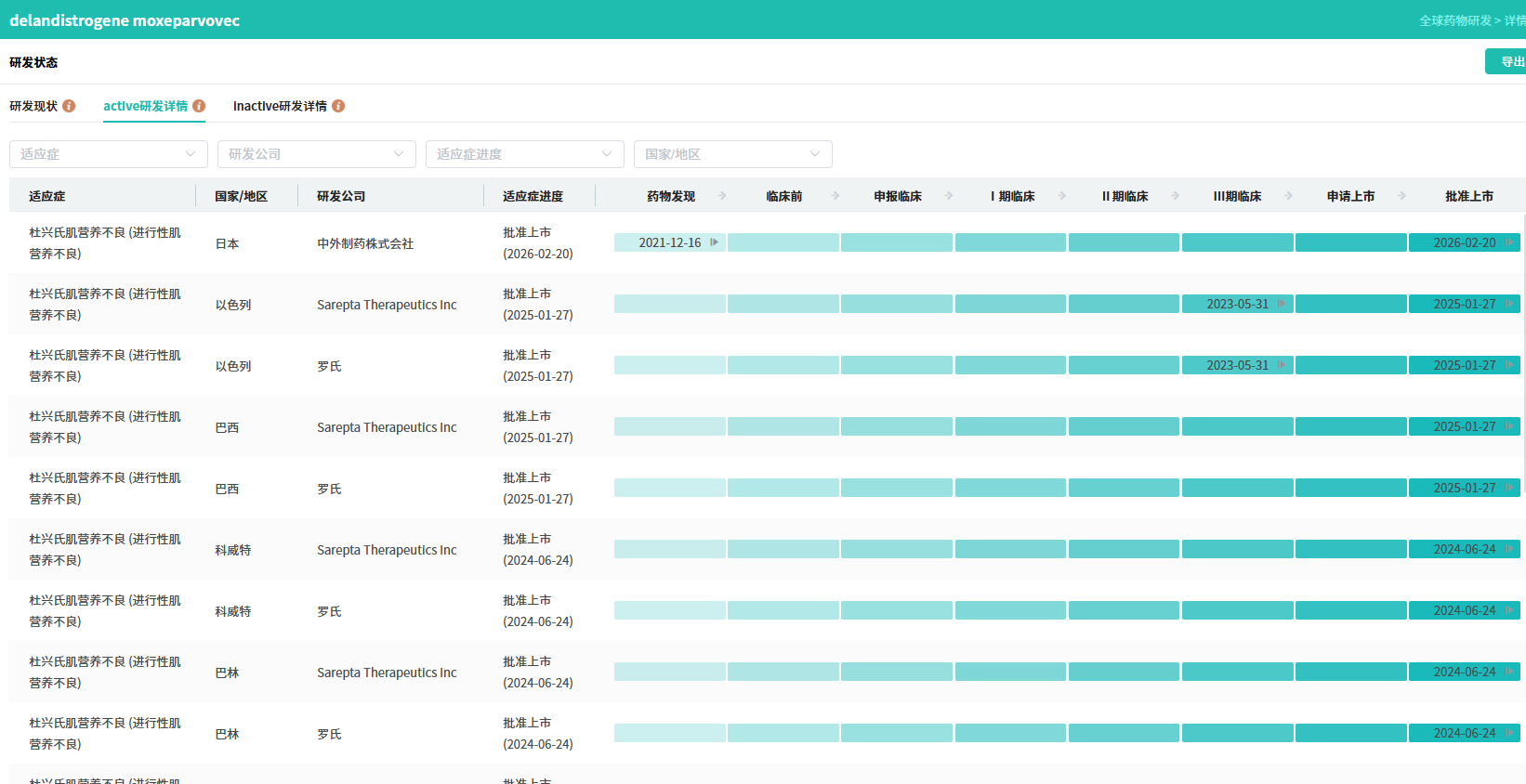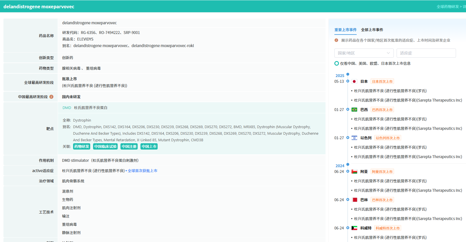 该药物于2023年6月22日在美国率先上市,随后在2025年5月13日登陆日本市场。据摩熵医药数据库显示,截至目前,Elevidys 已在九个国家成功获批上市。