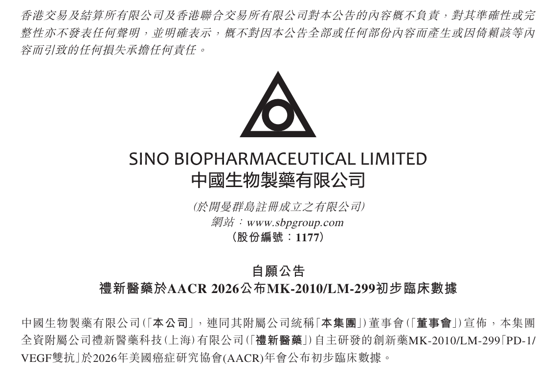 代表下一代肿瘤免疫治疗方向的PD-1/VEGF双抗赛道,又一“中国创新”重磅创新药披露最新临床数据。4月20日,港股医药龙头中国生物制药公告,正在美国圣地亚哥举行的美国癌症研究协会(AACR)年会上,中生旗下礼新医药的自主研发的创新药MK-2010/LM-299「PD-1/VEGF双抗」首次公布人体临床数据,ORR(客观缓解率)高达55%,相较同类产品显示出更优的疗效和安全性潜力。