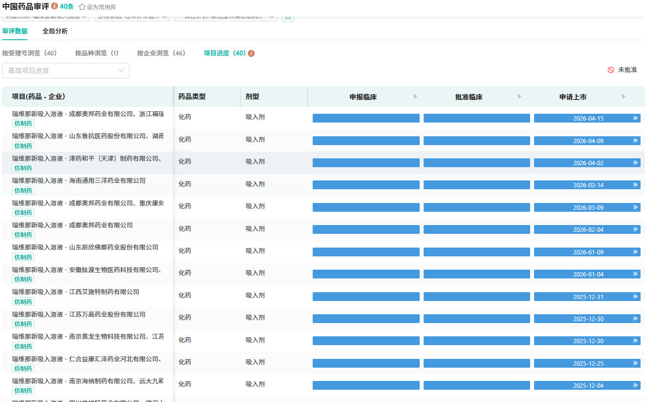国内仿制布局同样迅速。摩熵医药资料显示,倍特药业在2025年6月19日首家提交了瑞维那新吸入溶液的4类仿制上市申请,随后齐鲁制药、科伦药业、复星医药等企业纷纷跟进。截至目前,参与该品种仿制申报的企业已超40家,吸入制剂赛道竞争日趋激烈。