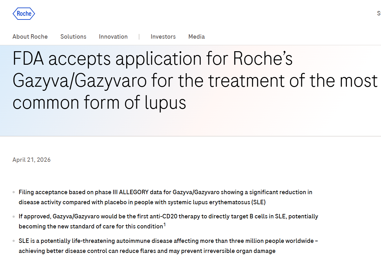 2026年4月21日,罗氏宣布,奥妥珠单抗用于治疗系统性红斑狼疮(SLE)的补充生物制剂许可证申请(sBLA)已获FDA受理,并获优先审评资格。PDUFA目标日期定为2026年12月。若最终获批,该药将成为全球首个用于治疗系统性红斑狼疮的CD20靶向疗法。