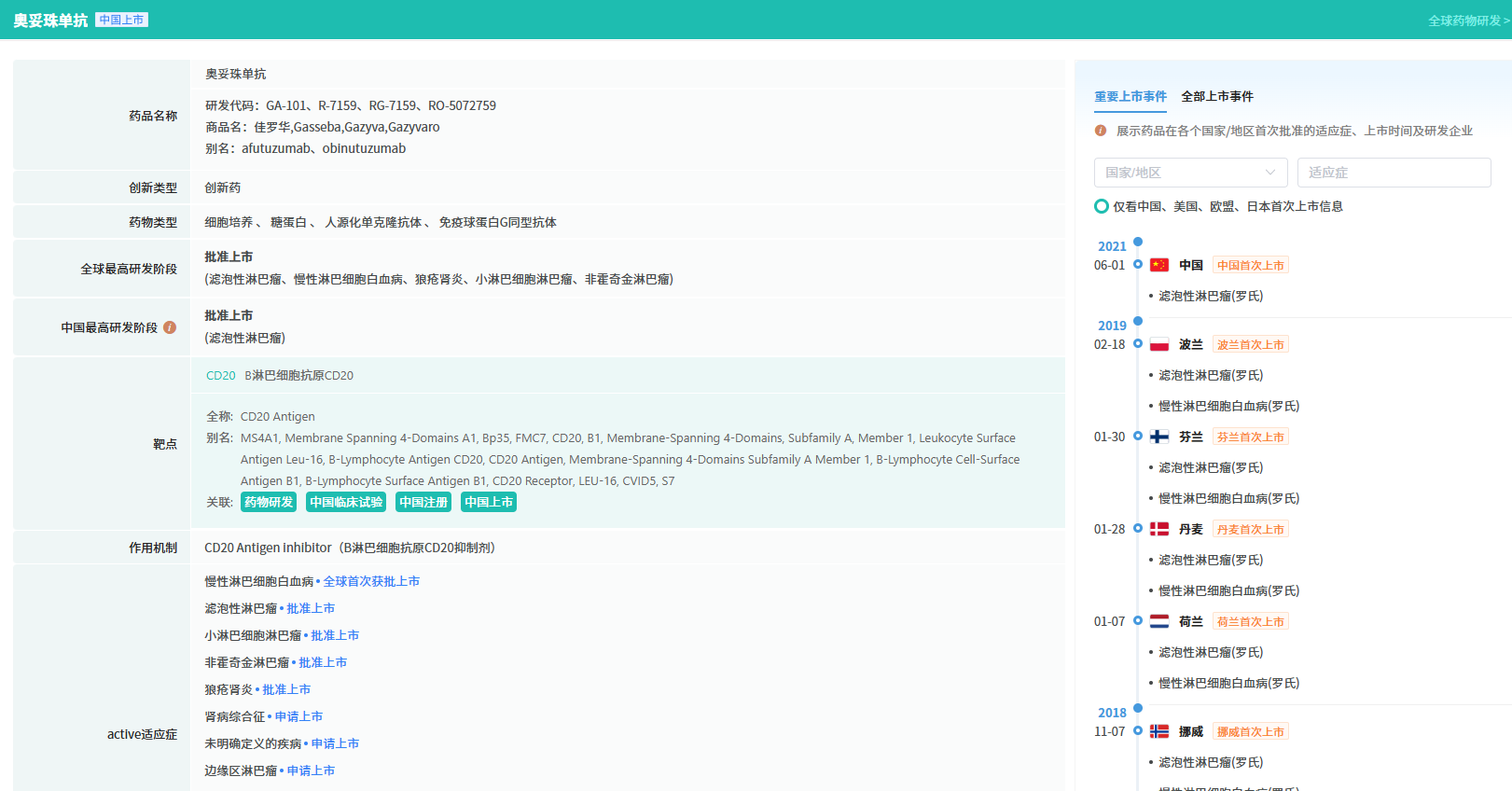 据摩熵医药数据库显示,该药自2013年首次在美国获批以来,已在血液肿瘤领域建立起坚实基础,陆续获批用于治疗慢性淋巴细胞白血病、滤泡性淋巴瘤等适应症。
