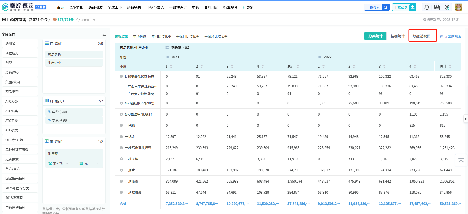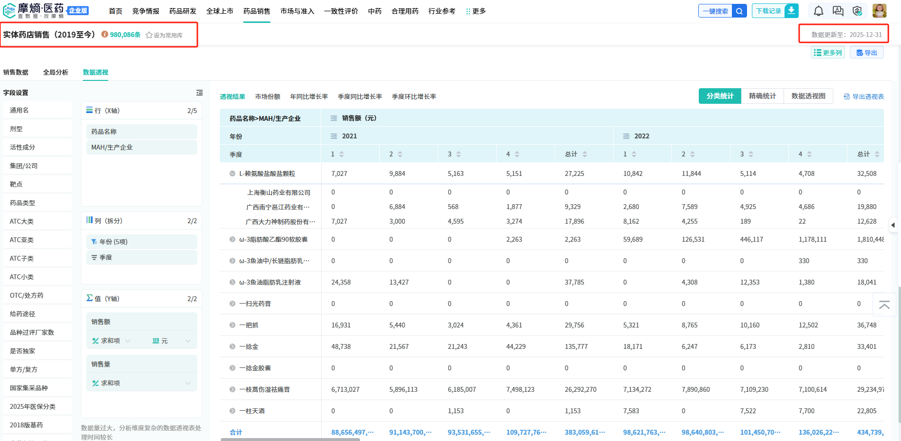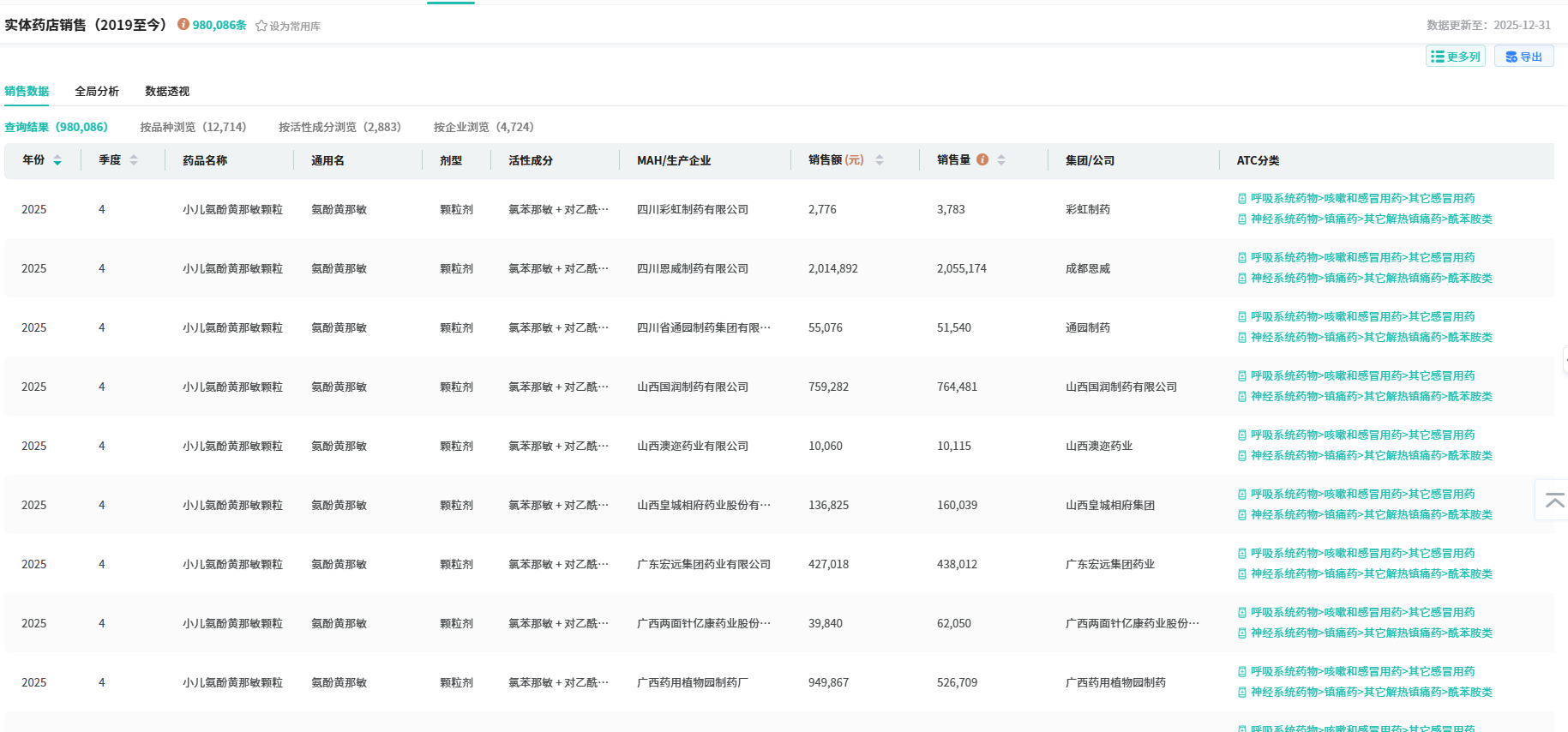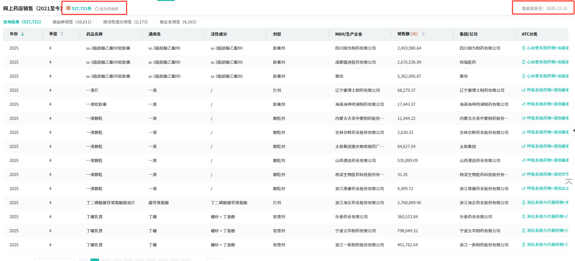 已完成2025年第三、四季度数据更新,目前总数据量超52万条。数据库依托国内主流电商平台(B2C)全量交易数据,覆盖化学药/生物药2000 +品种及中成药4000 +品种,精准反映线上医药零售市场趋势。