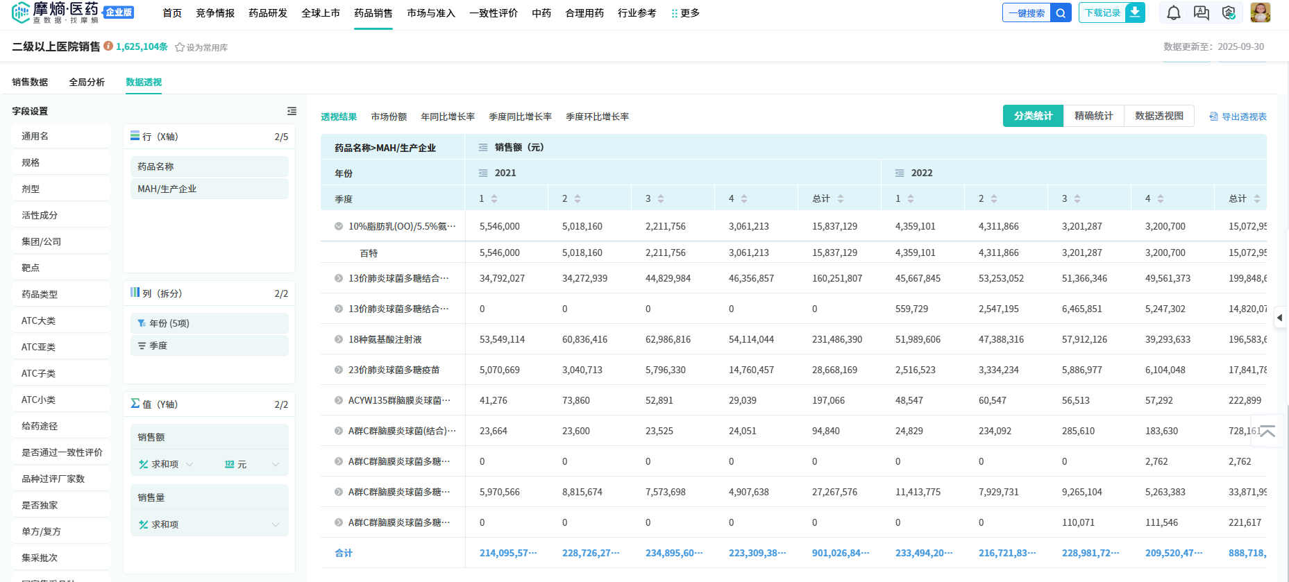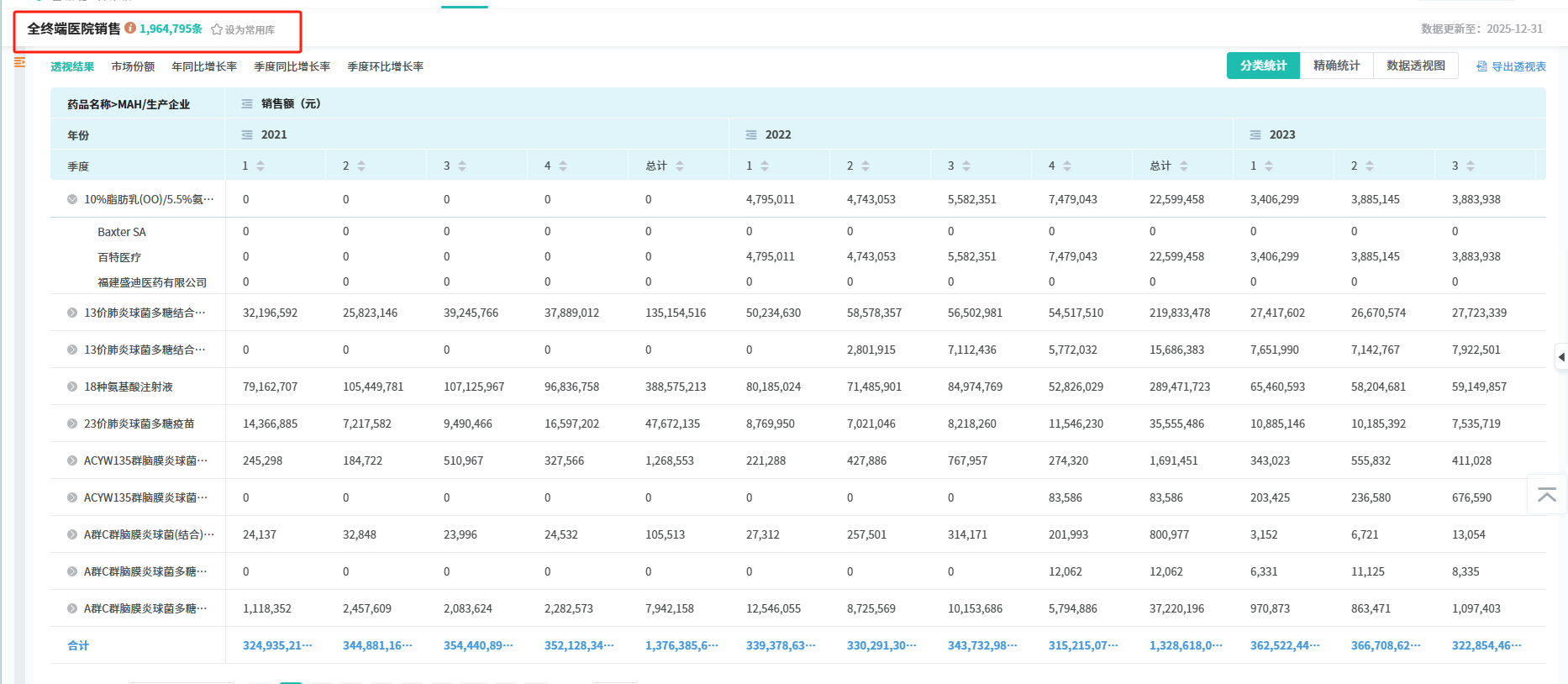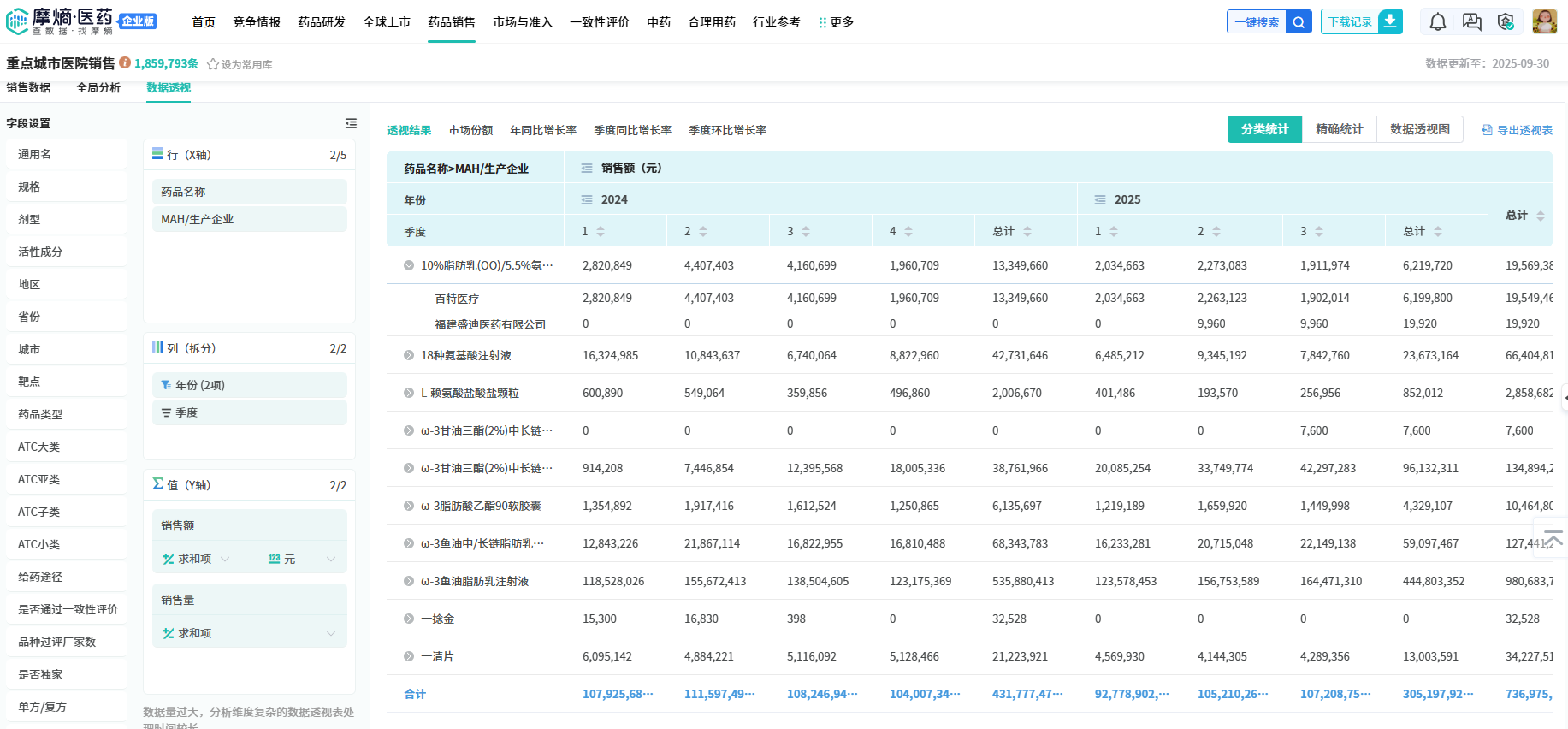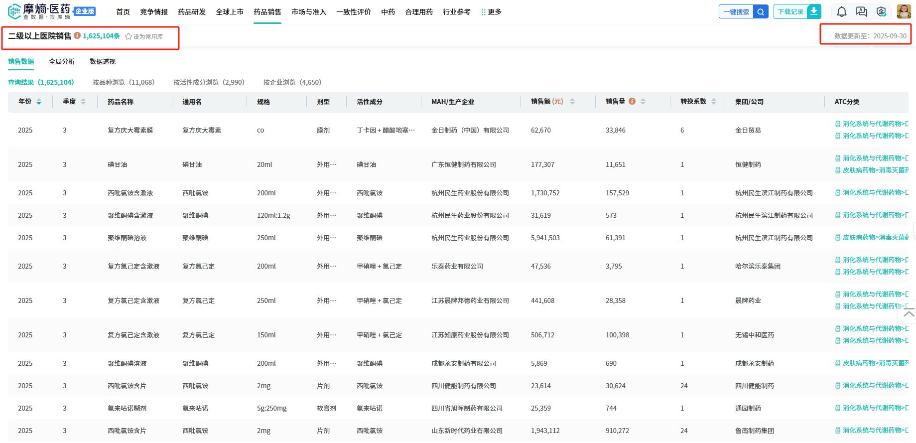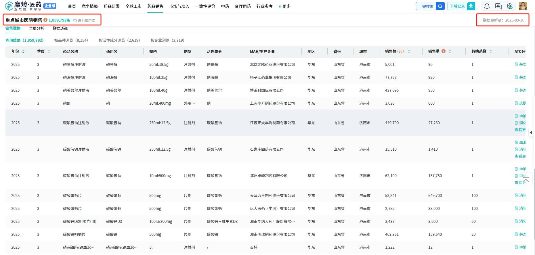 已完成2025年第三季度数据更新,目前总数据量超185万条。数据库覆盖31省39城3000余家医院,深度囊括化学药、生物药及中成药共8800 +通用名品种,数据细分至剂型与规格。