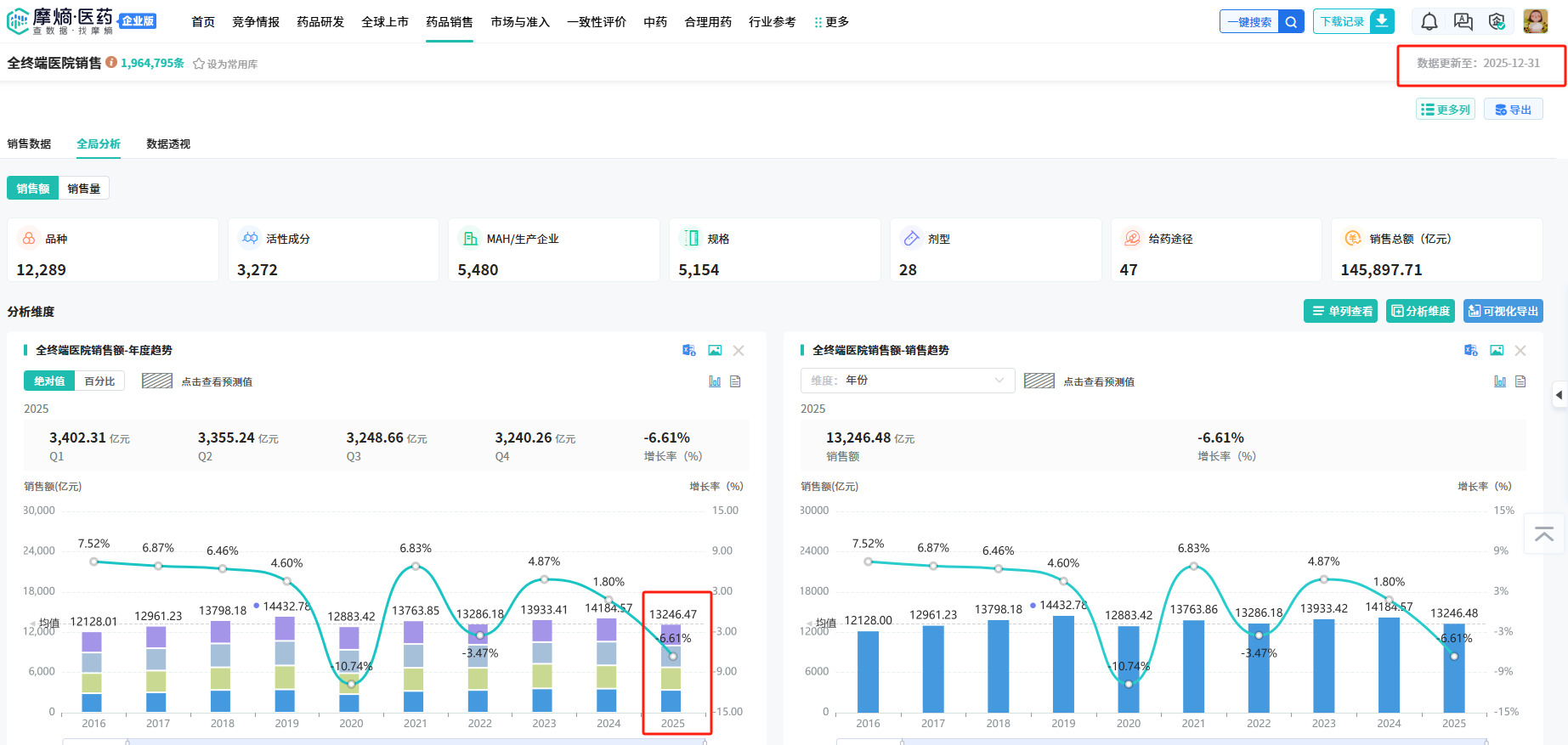 已完成 2025 年第三、四季度数据更新,目前总数据量超196万条。可助您实时分析竞争药品销售趋势,多维度评估竞品优劣势,监控终端市场高增长潜力品类与细分赛道,是分析市场竞争格局、预测市场销售动态的得力助手。