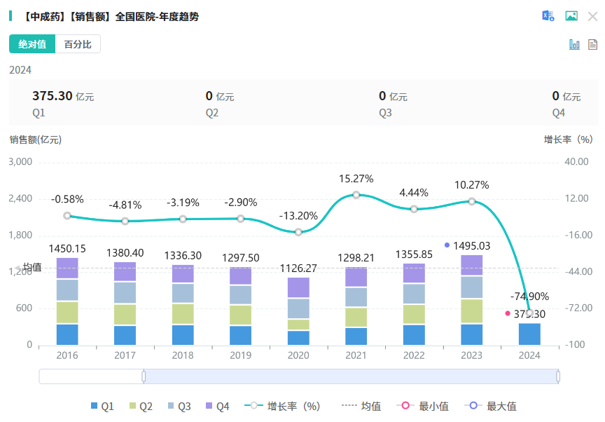 作为我国中药产业的三大支柱之一,中药饮片市场表现亮眼,是唯一在收入与利润上均实现增长的子行业。据中国医药企业管理协会数据显示,中药饮片市场已超过2000亿规模。浙商证券分析预测,中药饮片联采将持续提质扩面,进一步推动行业发展。摩熵医药数据库显示,2023年全国院内市场中成药的销售额超1400亿元,市场潜力无限。