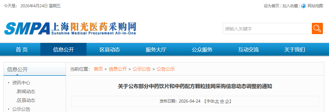4月24日,上海市医药集中招标采购事务管理所(上海阳光医药采购网)官网发布《关于公布部分中药饮片和中药配方颗粒挂网采购信息动态调整的通知》。