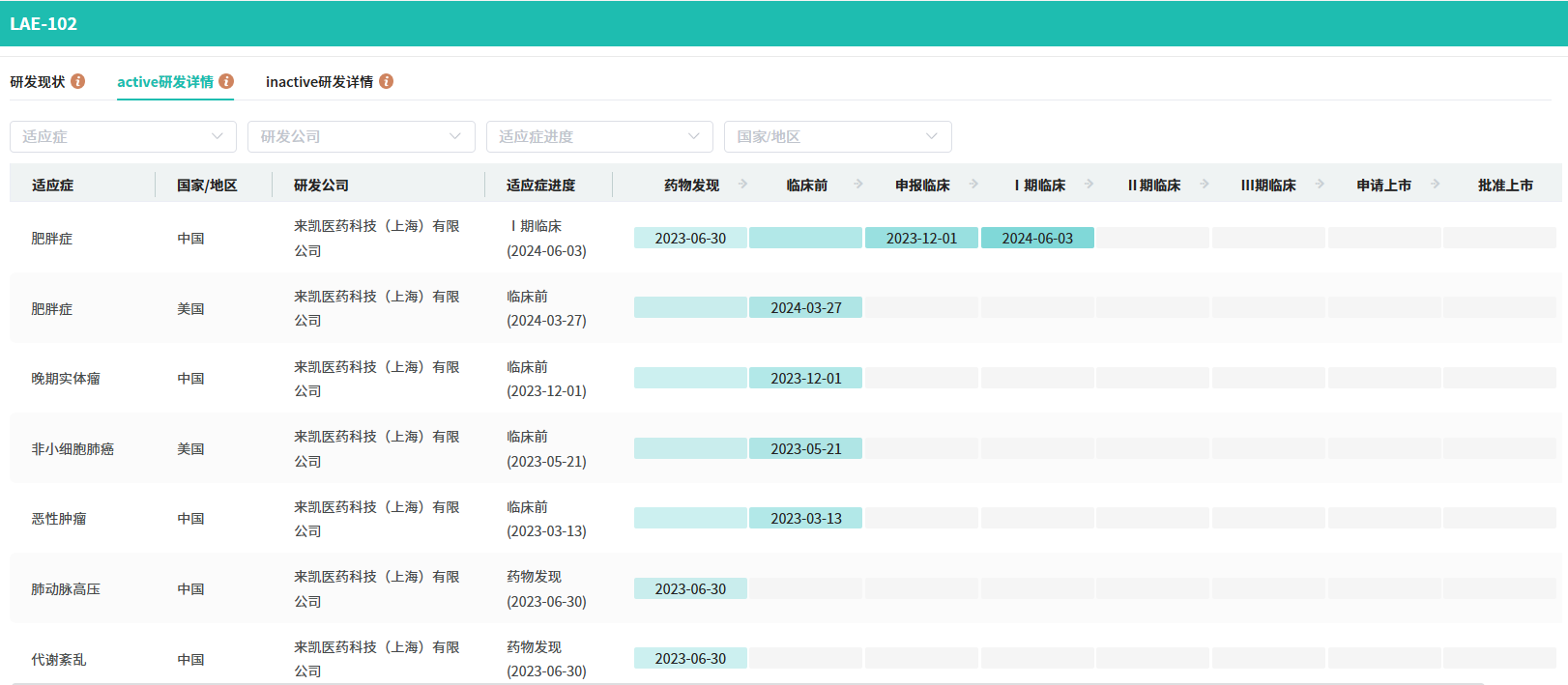 2024年6月LAE102的Ⅰ期临床研究启动,10月16日,LAE102针对超重/肥胖在中国开展的I期临床试验取得重大进展:单次剂量递增(SAD)研究的皮下注射(SC)部分已启动。