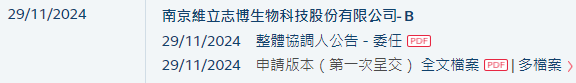 2024年11月29日,南京维立志博生物科技股份有限公司递交中国香港IPO申请;公司是一家临床阶段的生物科技公司,致力于创新疗法的发现、开发及商业化,以满足中国及全球在肿瘤、自身免疫性疾病及其他重大疾病方面未获满足的医疗需求。已设计具差异化的包括12款创新候选药物在内的丰富管线,其中6款已成功进入临床阶段。