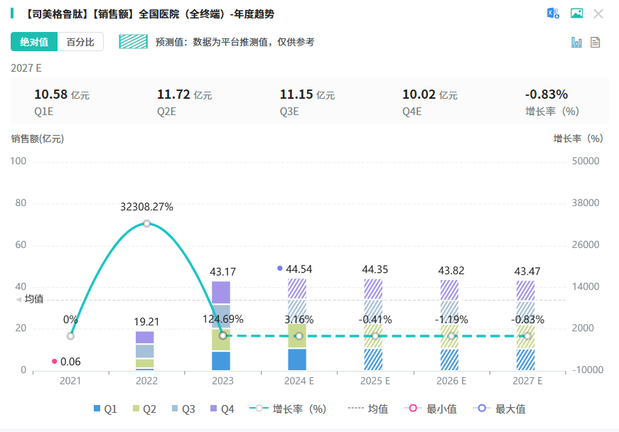 在国内,司美格鲁肽注射液的市场竞争正在升温。除了原研企业诺和诺德不断加大产能和推广力度,助推产品销售增长,在国内药企方面,九源基因、丽珠医药等企业也在加速产品研发进程。据摩熵医药数据库显示,2023年司美格鲁肽在全国院内(全终端)销售额超43亿元,随着更多药企加入竞争,预计2025年将超44亿元,未来国内司美格鲁肽市场将呈现百家争鸣的繁荣景象。