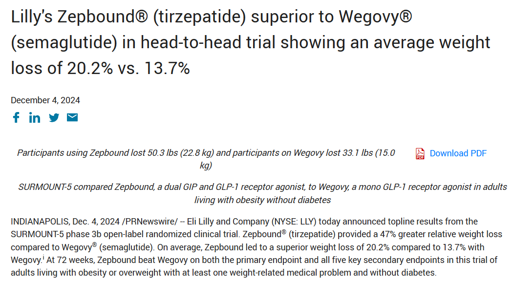 12月4日,礼来宣布IIIb期 SURMOUNT-5 研究取得了积极结果。该研究旨在评估Zepbound(替尔泊肽)与Wegovy(司美格鲁肽)相比,针对肥胖或伴有至少一种合并症的超重的非2型糖尿病成人患者在体重减轻方面的有效性和安全性。