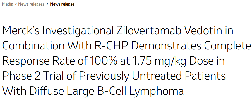 本次默沙东公布的是一项名为WaveLINE-007的2期临床试验结果,试验评估了不同剂量 Zilovertamab vedotin 联合 R-CHP 治疗先前未治疗的DLBCL患者的疗效与安全性。共有 36 名患者参加了该研究,所有患者的中位随访时间为17.6个月,结果表明,接受1.75 mg/kg、2.0 mg/kg、2.25 mg/kg 三个不同剂量的患者客观缓解率 (ORR) 分别为100%、93.3% 、100%。并非所有患者均达到中位缓解持续时间(DOR),12个月DOR为93.5%。根据数据,确定 Zilovertamab vedotin 推荐剂量为1.75 mg/kg。