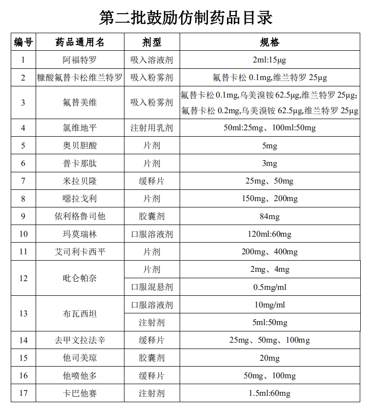 3月15日,国家卫健委联合科技部、工业和信息化部、国家医保局、国家药监局、国家知识产权局等部门组织专家对国内专利即将到期尚未提出注册申请及临床供应短缺(竞争不充分)的药品进行遴选论证,并制定了《第二批鼓励仿制药品目录》进行发布。其中包含了米拉贝隆、奥贝胆酸等在内的17个品种。(国家卫健委)