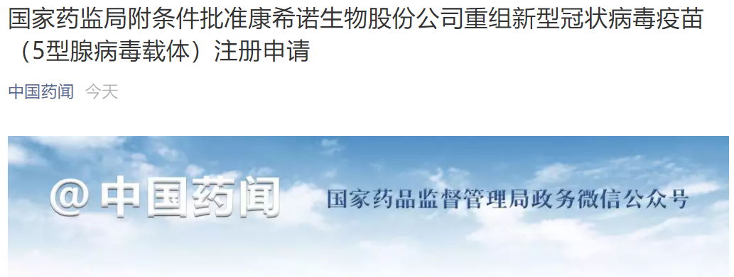 2月25日,国家药品监督管理局附条件批准康希诺生物股份公司重组新型冠状病毒疫苗(5型腺病毒载体)注册申请。该疫苗是首家获批的国产腺病毒载体新冠病毒疫苗,适用于预防由新型冠状病毒感染引起的疾病(COVID-19)。