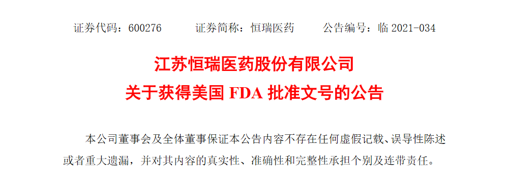 3月22日,恒瑞医药发布公告称,近日收到美国FDA通知,恒瑞医药向美国FDA申报的注射用卡莫司汀简略新药申请已获得批准。