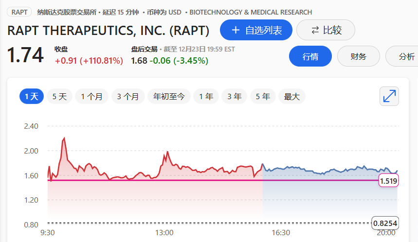 受该合作消息的影响,RAPT Therapeutics当天股价大涨111%,目前市值为6083万美元。