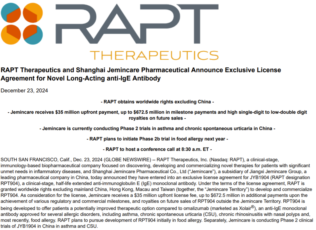 2024年12月23日,RAPT Therapeutics宣布引进济民可信长效IgE抗体 JYB1904(RPT904)的大中华区外全球权益,RAPT Therapeutics支付3500万美元预付款,最高6.725亿美元里程碑金额,以及一定比例的销售分成,协议总金额7.075亿美元。JYB1904目前处于中国二期临床研究阶段。