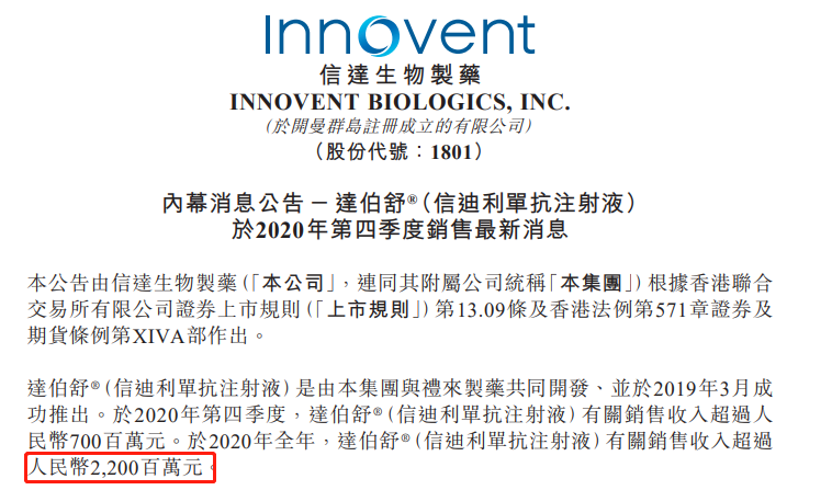 2021年1月29日,信达生物发布内幕消息公告,其PD-1单抗达伯舒(信迪利单抗注射液)2020年全年销售收入超过22亿元人民币,第四季度超过7亿元人民币。作为首个进入国家医保目录的PD-1抑制剂,达伯舒(信迪利单抗注射液)2020年收入实现同比大幅增长。