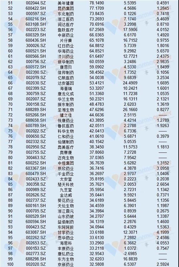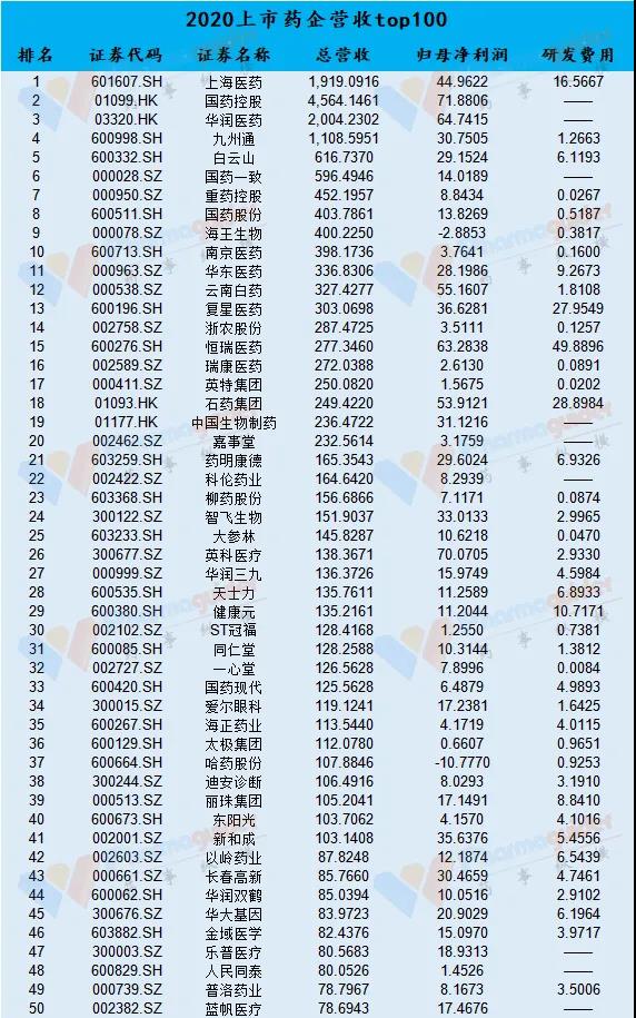 在去年美国《制药经理人》杂志(PharmExec)评选的2020年全球制药企业50强排行榜中,国内企业方面,云南白药、中国生物制药、恒瑞医药及上海医药4家企业登上榜单。从我们的top100来看,未来或有更多的药企进入全球制药50强。