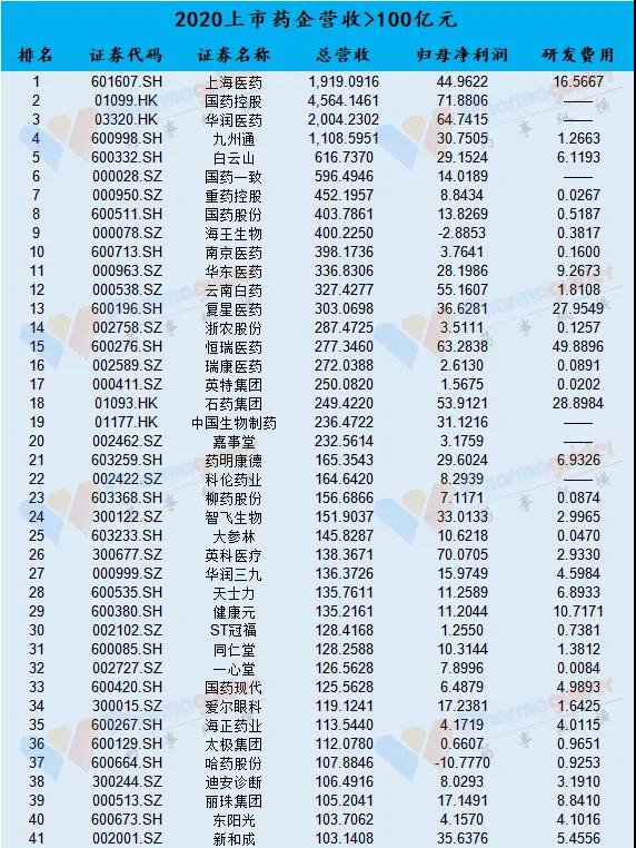 100亿元,对于一个药企营收来说是一个重要关口。截止到4月27日,绝大多数药企已经公布了2020年报,我们根据财报数据来看下百亿元俱乐部分布情况,另外未上市的企业中扬子江药业营收千亿级别,修正药业700多亿,济民可信300多亿,齐鲁制药200多亿,鲁南制药100多亿元等。从top100来看,营收百亿元以上有41家。