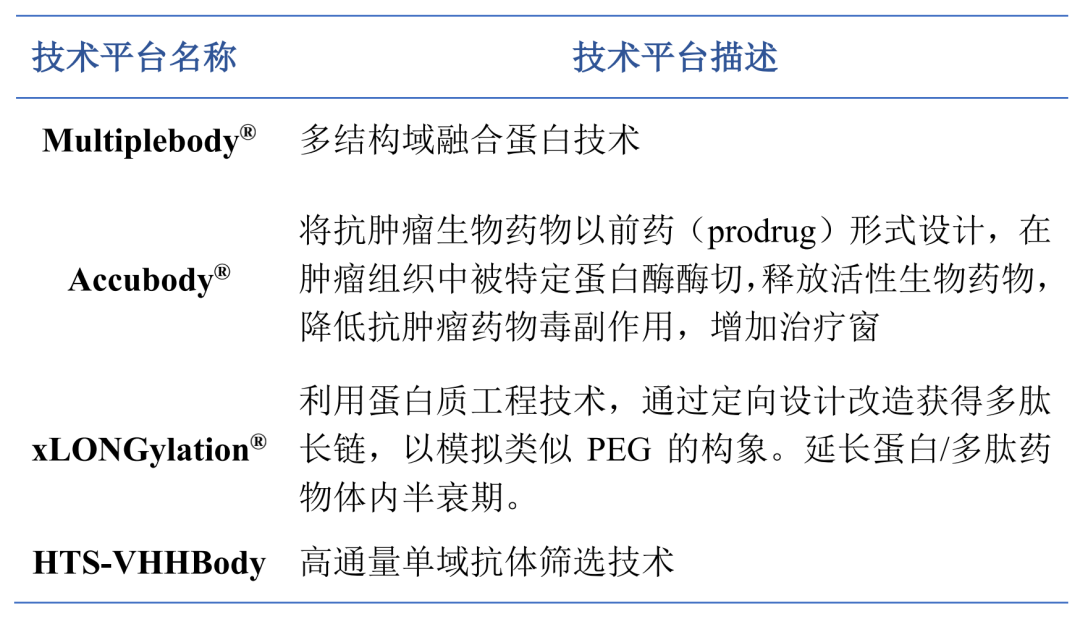 道尔生物是一家拥有自主知识产权,从事抗体、融合蛋白及多肽药物开发的平台型研发公司。拥有xLONGylation®重组类PEG化修饰技术平台、MultipleBody®多靶点技术平台、AccuBody®肿瘤精准给药技术平台、以及HTS-VHHBody单域抗体的高通量发现和改造平台等多个独创的蛋白工程、抗体工程平台技术。