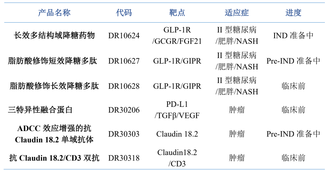 道尔生物聚焦肿瘤、代谢、眼科等领域,开发了多个基于多结构域的多特异性融合蛋白药物和创新单域抗体药物。现已有6款重点在研产品在临床前研究中展示出良好的体内及体外药效,其中1款治疗胃癌的候选药物和2款治疗Ⅱ型糖尿病、NASH(非酒精性脂肪肝)等代谢疾病的候选药物,已基本完成了临床前研究工作,计划于2021年内提交临床试验申请。