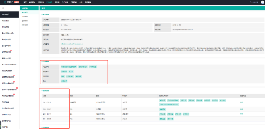 医药投融资数据库——新增企业画像、聚合企业融资信息、对外投资,直观展示企业最新投融资进展等模块