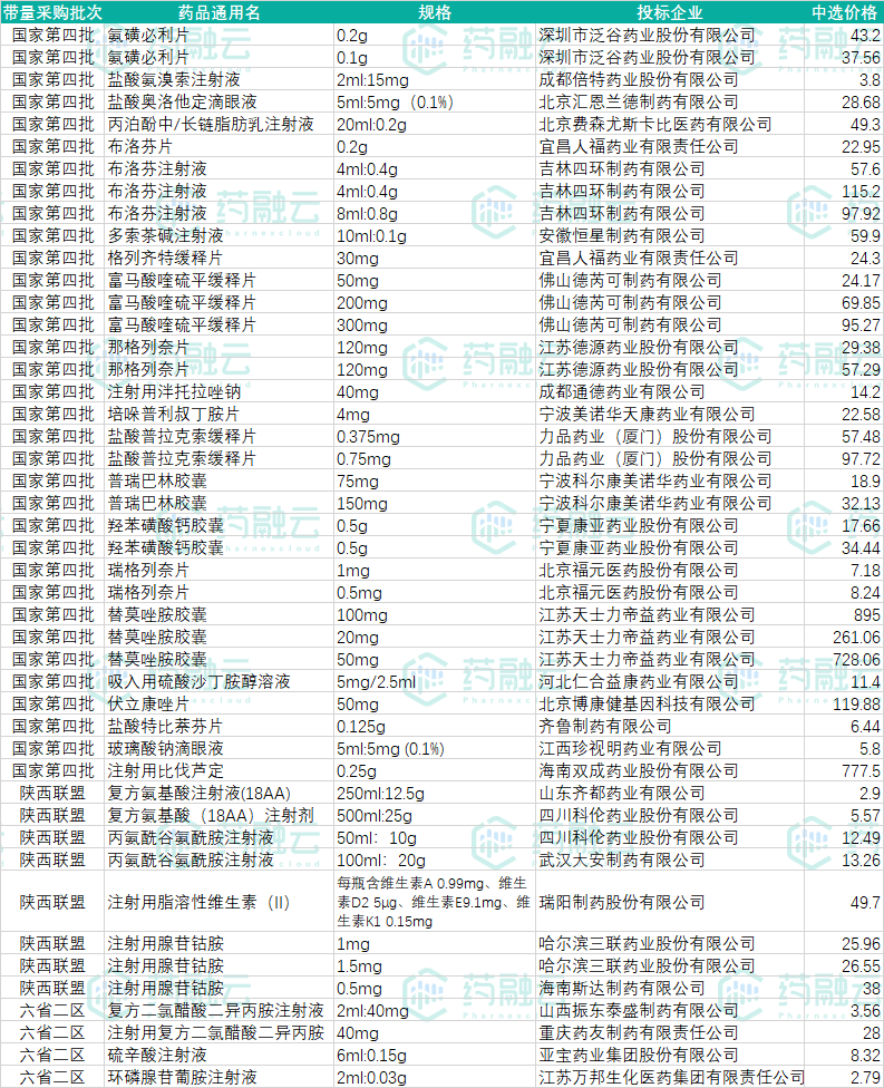 5月11日,山西省药械集中招标采购中心发布通知,依据企业申请和医疗机构实际用药需求,第四批全国药品集中采购、陕西省省际联盟药品集中带量采购、“六省二区”省际联盟药品集中带量采购中选品种带量采购目录中深圳市泛谷药业股份有限公司等31个企业生产的氨磺必利片等46个产品(具体清单见下图),除满足合同约定量采购之外,所有医疗机构均可按照中选价格通过平台进行阳光采购。企业承诺以中选价格供应,满足我省医疗机构的临床需求。(山西省药械集中招标采购中心)