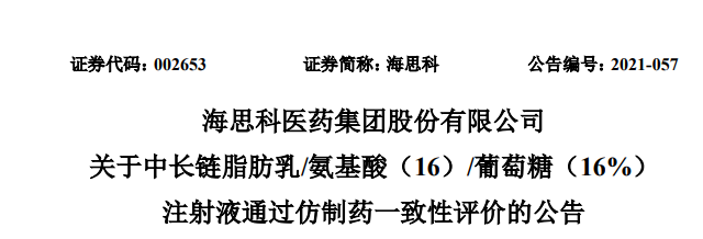 开发的仿制药产品中长链脂肪乳/氨基酸(16)/葡萄糖(16%)注射液,于 2018 年 7 月取得国家药品监督管理局颁发的药品注册批件(批件号:2018S00429)。2019 年 12 月公司向国家药品监督管理局药品审评中心提交一致性评价补充申请并获受理,2021 年 5月,该产品正式通过仿制药一致性评价。