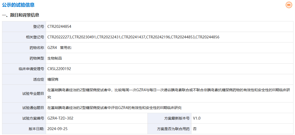 GZR4是甘李药业开发的一种超长效胰岛素制剂,于2021年进入新药研究申请(IND)阶段,于2022年启动了首个I期临床试验。目前,GZR4已完成一项II期研究,相关结果也已披露。