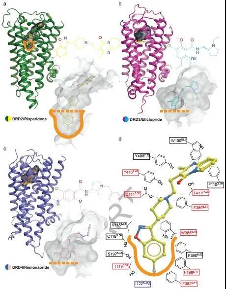 图1 DRD2(a)和DRD3(b)、DRD4(c)配体结合位点的比较