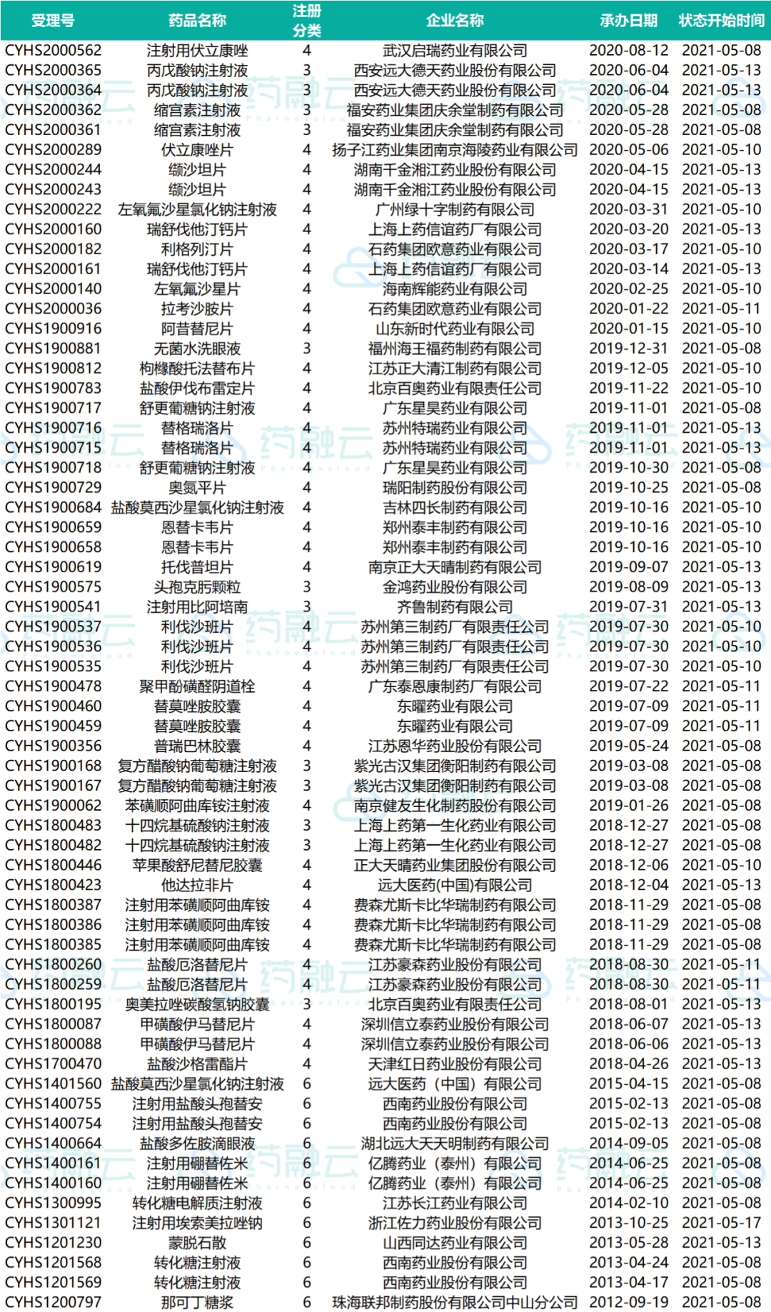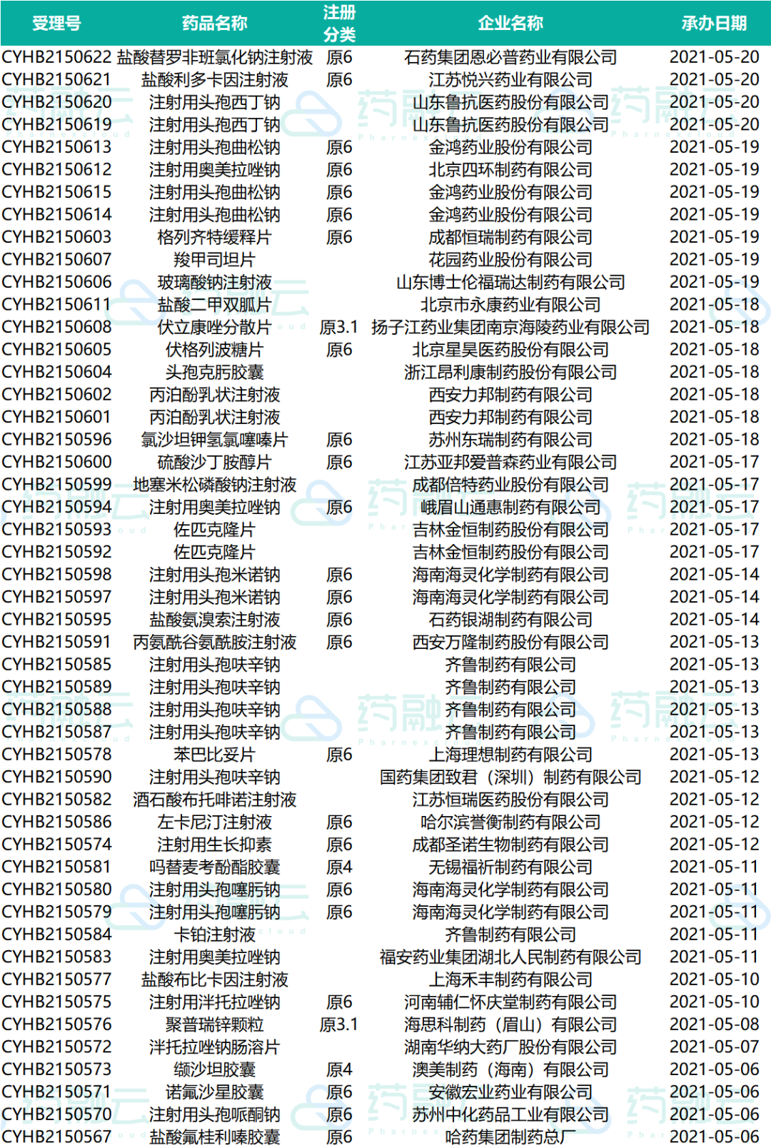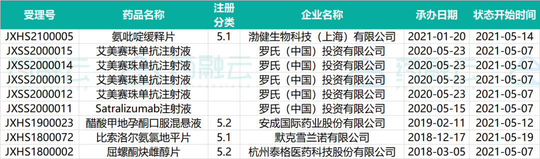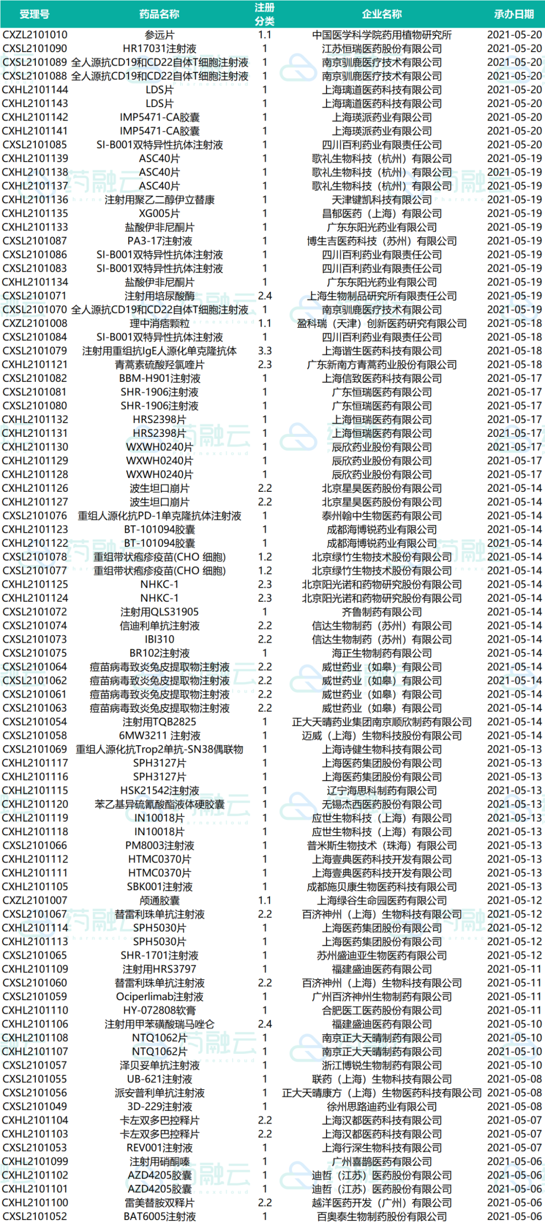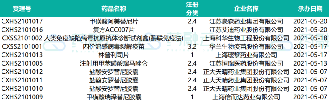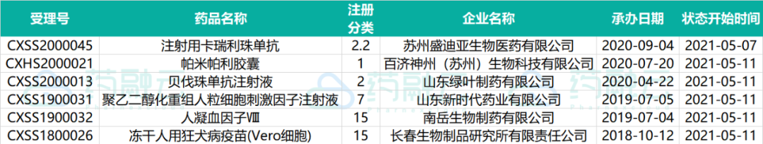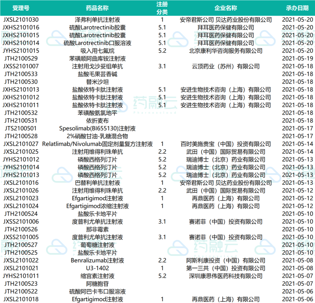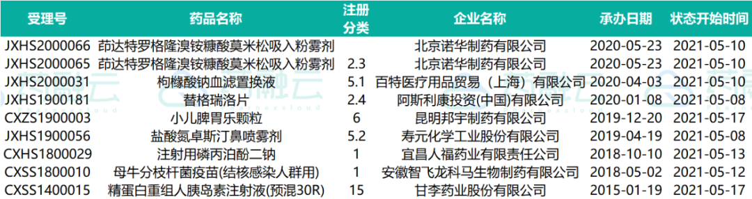 下表为2021.05.01-2021.05.20申请上市的药物情况