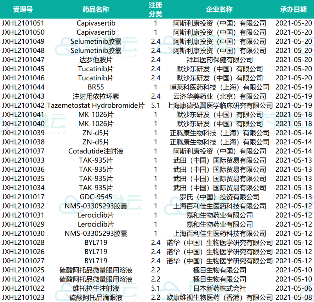 下表为2021.05.01-2021.05.20申请临床的新药药物情况