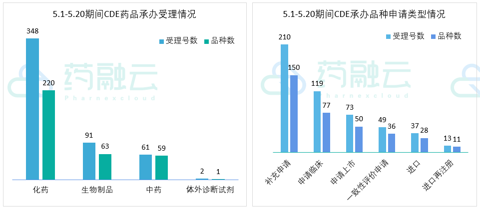 根据药融云中国药品审评数据,5月1号-5月20号期间共343个(按品种计,下同)药品获CDE承办,包括化药230个,生物制品63个,以及中药59个。