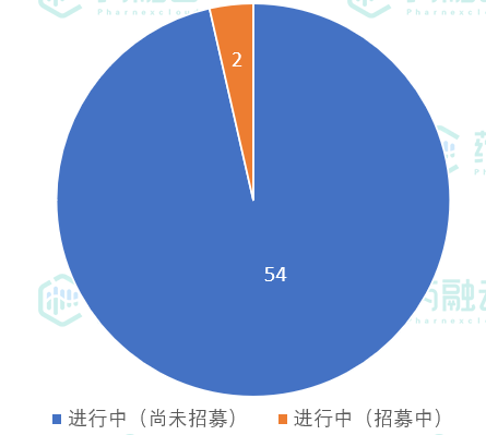 从实验状态来看,56项试验均在进行中,其中54项尚未开始招募,2项试验正在招募中。