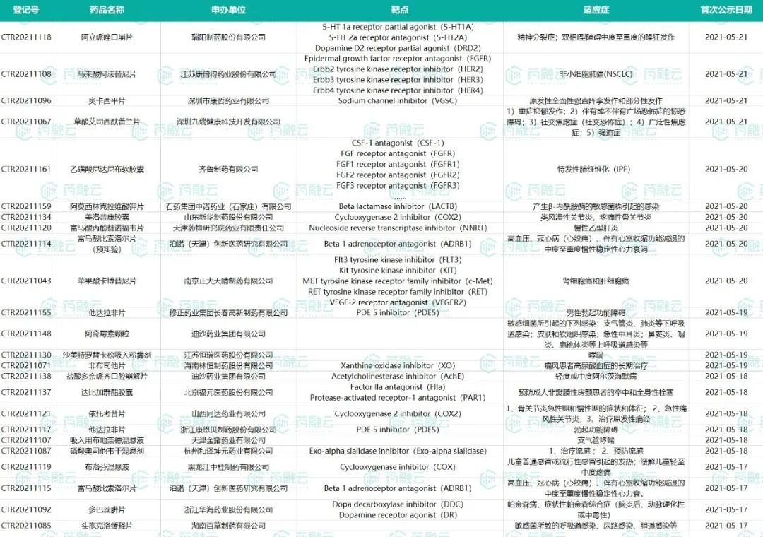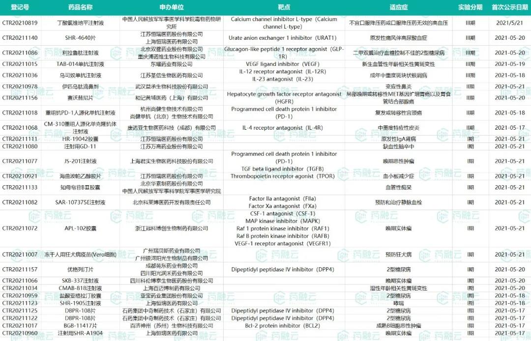 5月17日-5月23日新公示国内新药试验汇总